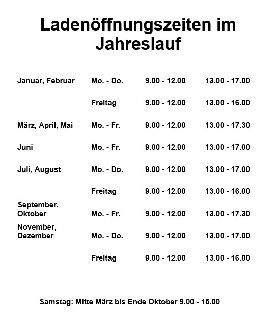 Öffnungszeiten Pflanzencenter: Januar, Februar:Montag bis Donnerstag:09.00-12.00 und 13.00-17.00Freitag:09.00-12.00 und 13.00-16.00Samstag:geschlossen
